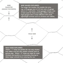 Our chicken wire is supplied in two different wire gauges 20 and 22 gauge, this means the wire is 0.9mm and 0.7mm thick, which is the standard for most chicken wire. We do also have some slightly heavier gauged wire in our largest 1.8m high rolls, this wire is 19 gauge (1mm) thick.