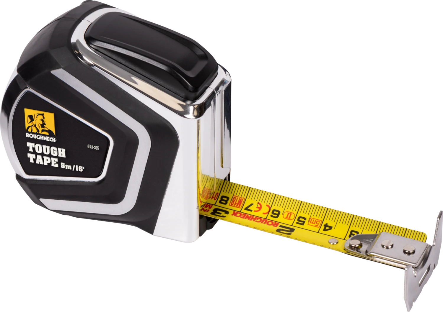 The Roughneck Tough Tape Measure are manufactured to the highest quality, they boast a durable chrome outer casing with a strong metal belt clip. Only lead free paint has been used on the blades, which have been finished off with a nylon coating for rust protection and longevity.Double sided printing with metric/imperial graduation, there is a powerful non-slip brake which holds the blade position. The double ended magnestic hook makes one person measuring easy & extra comfort has been incorporated with shock absorbing recoil.E-Z Read Blades where every 1/8″ is marked for easy reading, stud marking every 16″ and truss marking every 40cm