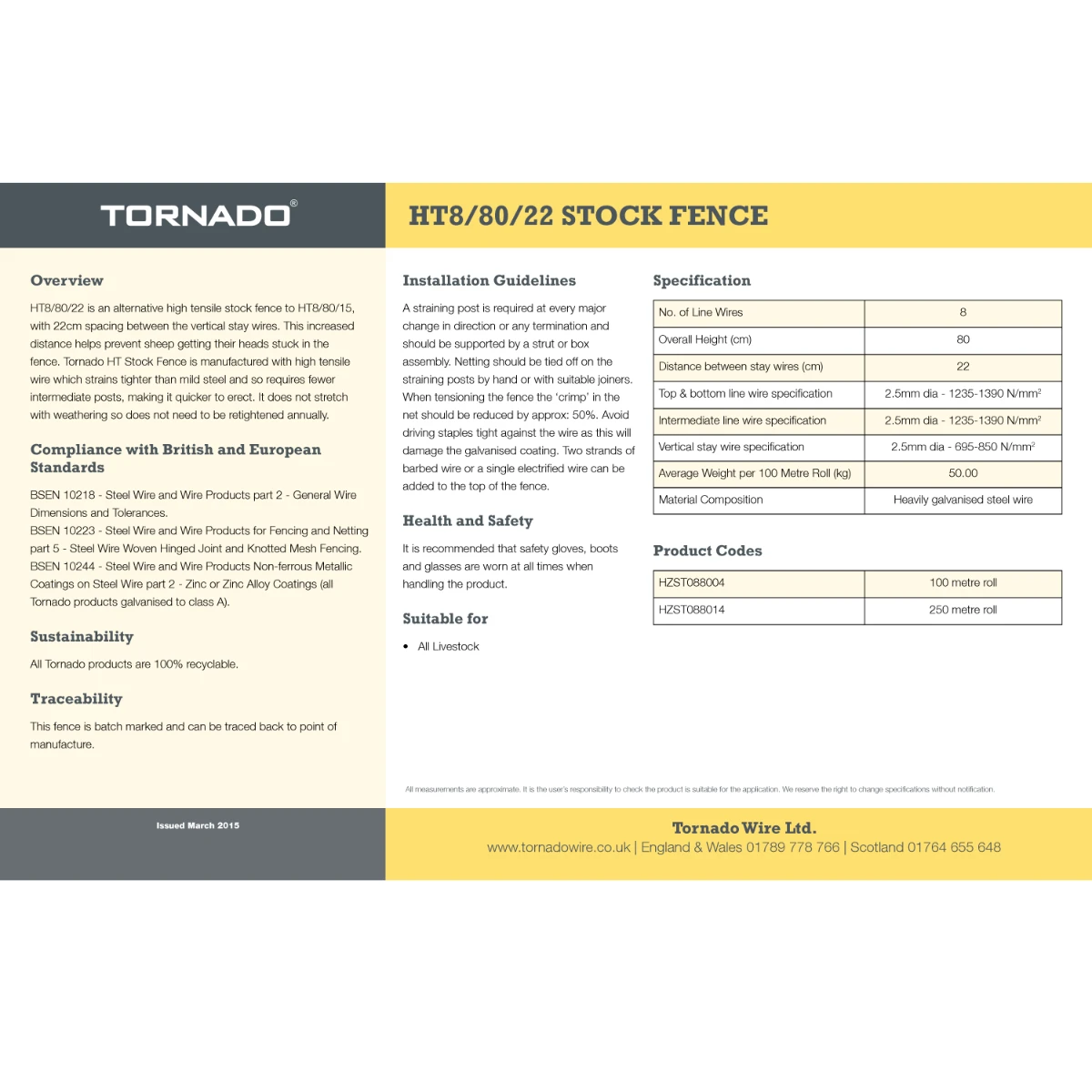 HT8/80/22 is an alternative high tensile stock fence to HT8/80/15, with 22cm spacing between the vertical stay wires. This increaseddistance helps prevent sheep getting their heads stuck in the fence. Tornado HT Stock Fence is manufactured with high tensile wire which strains tighter than mild steel and so requires fewer intermediate posts, making it quicker to erect. It does not stretch with weathering so does not need to be retightened annually.