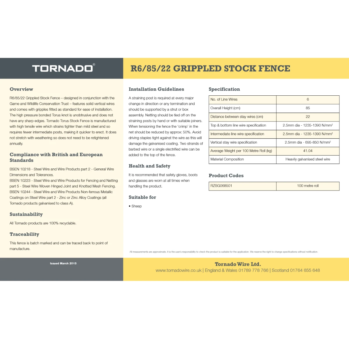 R6/85/22 Grippled Stock Fence is designed in conjunction with the Game and Wildlife Conservation Trust. The feature of this stock fence is the solid vertical wires and comes with gripples fitted as standard to make it easier when installing.