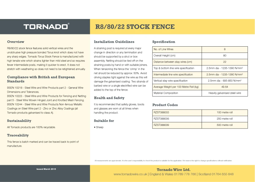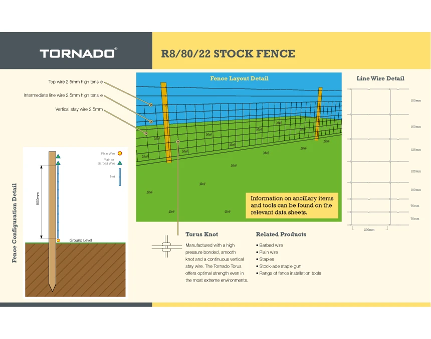 R8/80/22 stock fence features solid vertical wires and the unobtrusive high pressure bonded Torus knot which does not have any sharp edges. Tornado Torus Stock Fence is manufactured with high tensile wire which strains tighter than mild steel and so requires fewer intermediate posts, making it quicker to erect. It does not stretch with weathering so does not need to be retightened annually.
