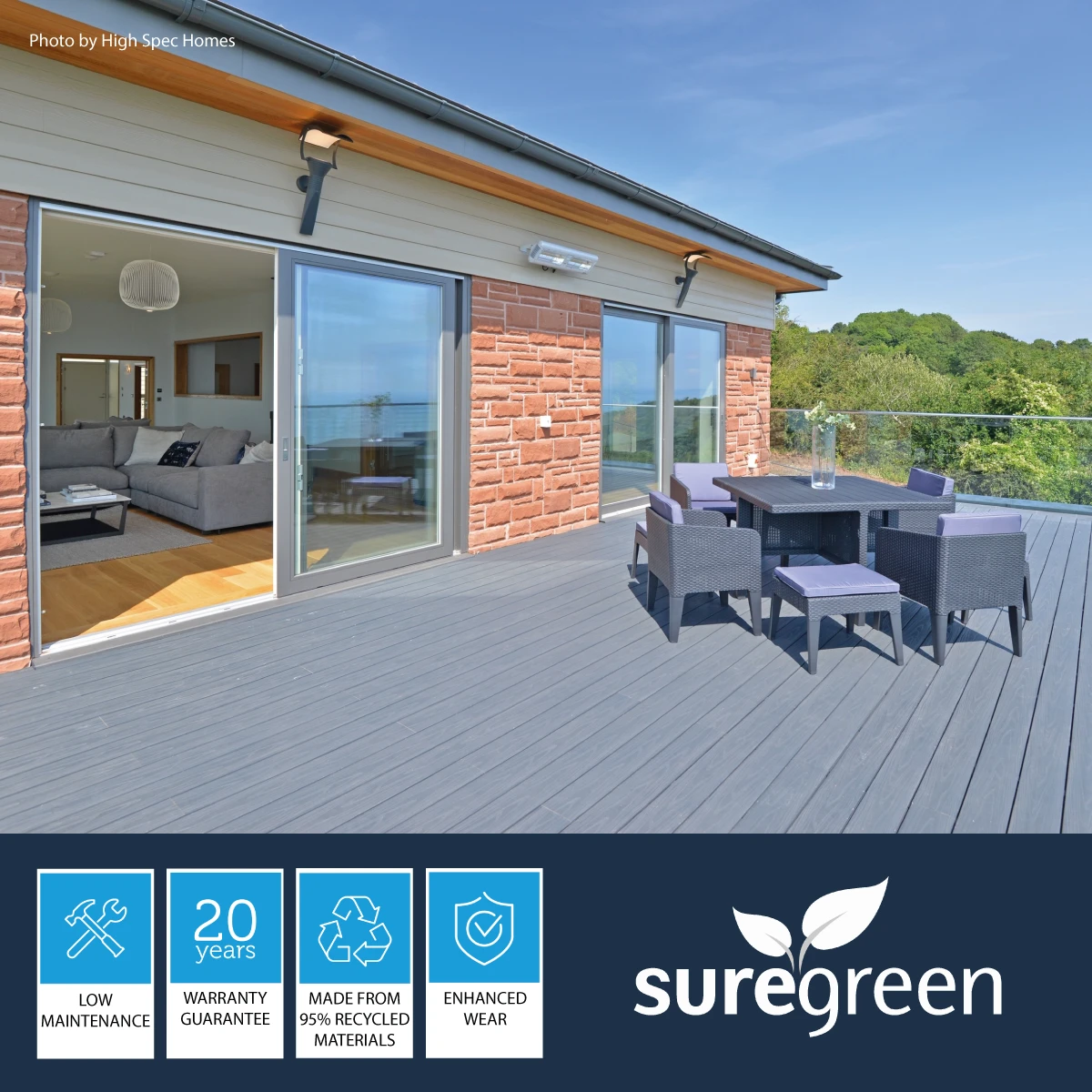 Its embossed woodgrain surface ensures a barefoot-friendly finish for those warm summer evenings and its stain- and UV-resistance means that the colour will not fade over time. This means we can proudly offer a 20-year manufacturer’s warranty!